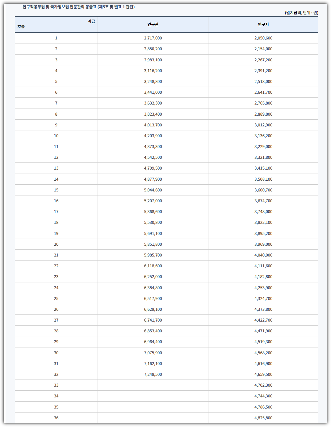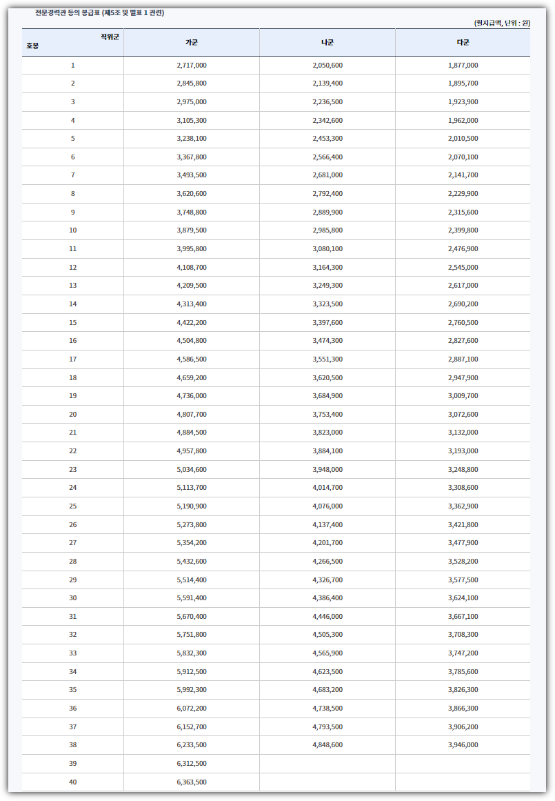 ■ 연구직공무원 및 국가정보원 전문관 봉급표