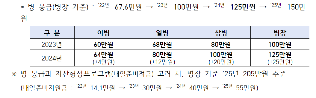 2024 군인 월급은 작년 100만원에서 올해 125만원으로 25% 인상됩니다. 내년에는 다시 25만원 올라 월 150만원을 받는다고 하네요. 정부의 자산 형성 프로그램인 내일준비지원금(2025년 55만원)을 합치면 내년 병장 급여는 총 205만원 수준이 되는 것인데, 올해 이병 봉급은 64만원, 일병 봉급은 80만원, 상병 봉급은 100만원입니다. 초급 간부인 소위와 하사 초임(1호봉) 봉급액이 작년 대비 6% 인상됩니다. 3년 미만 복무자에게도 월 16만원의 주택 수당을 확대 지급합니다.