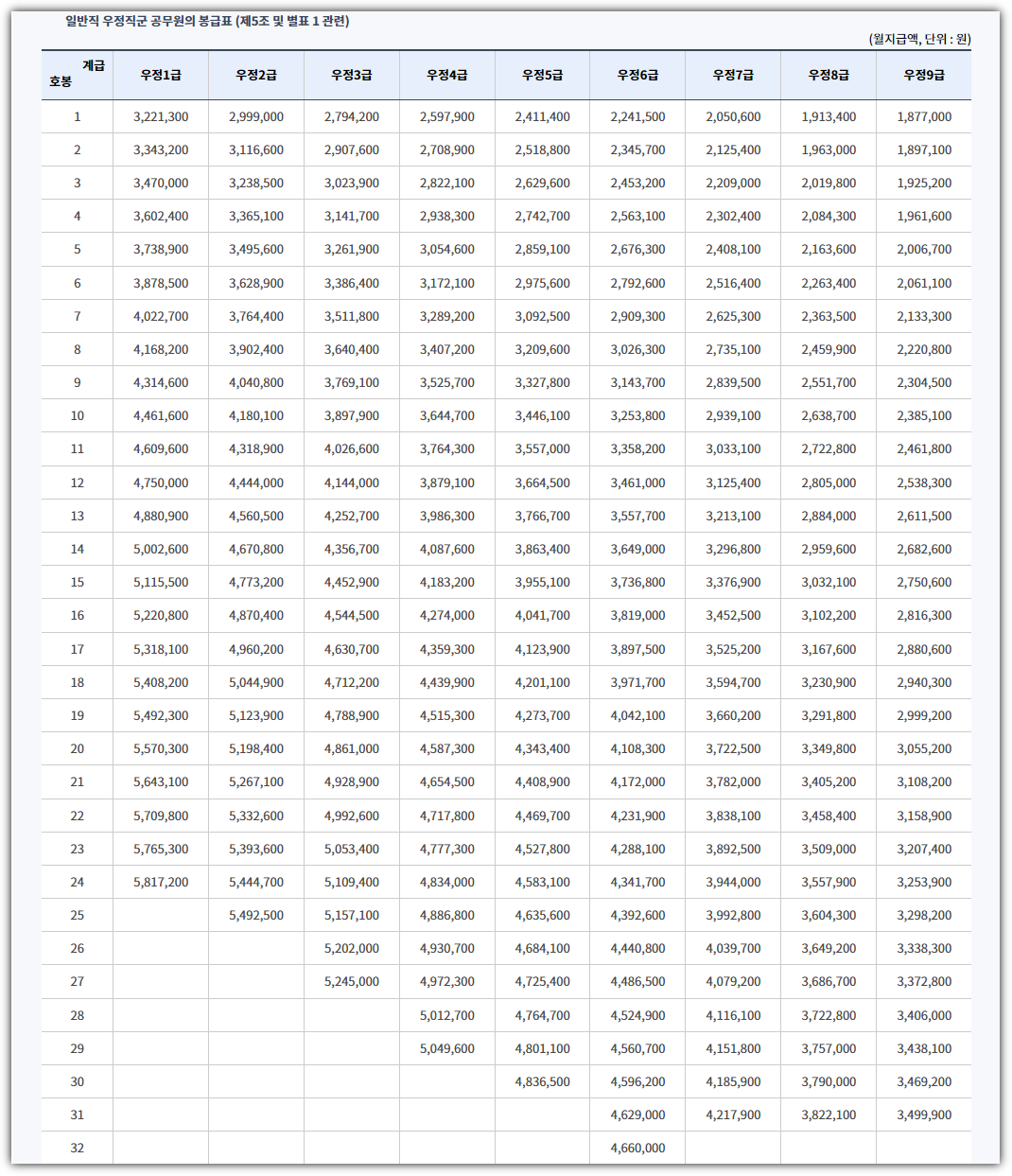 ■ 일반직 우정직군 공무원 봉급표
