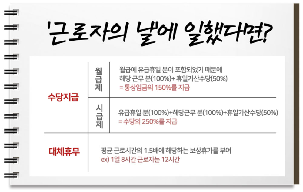 5월 1일 근로자의날 유급 일이기 때문에 쉬더라도 임금의 손실 없이 쉴 수 있습니다. 만약 근무를 하게 되면 휴일근로수당이 발생하는데요, 다만 5인 미만 사업장의 경우 휴일근무 가산수당(0.5배)을 지급하지 않아도 됩니다.