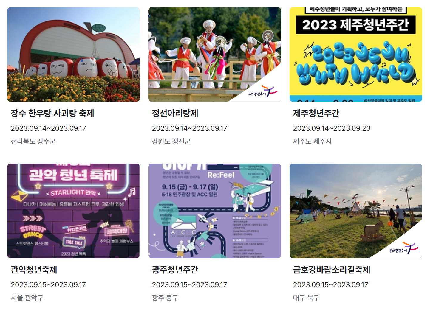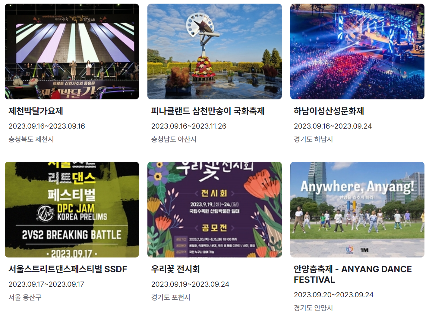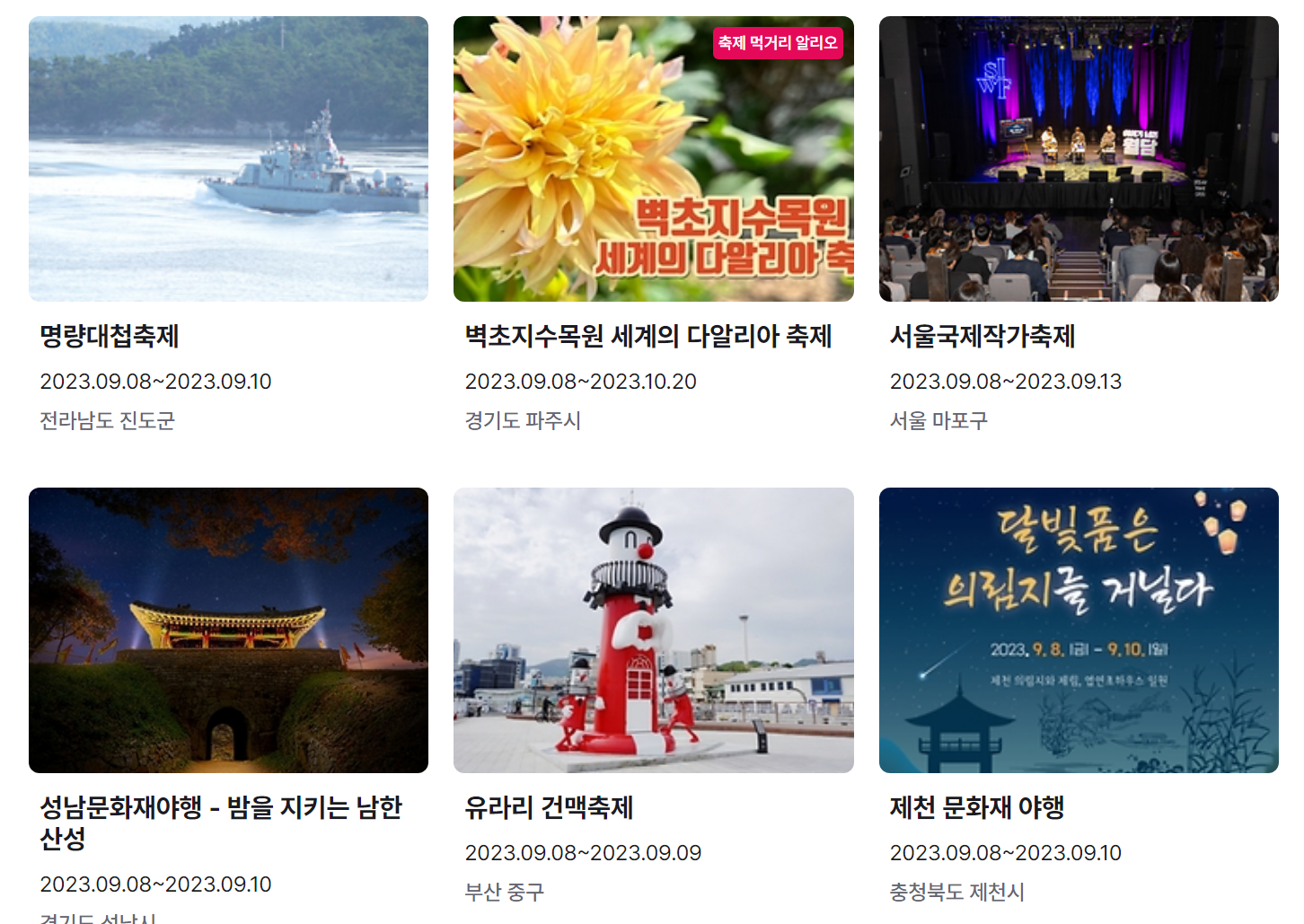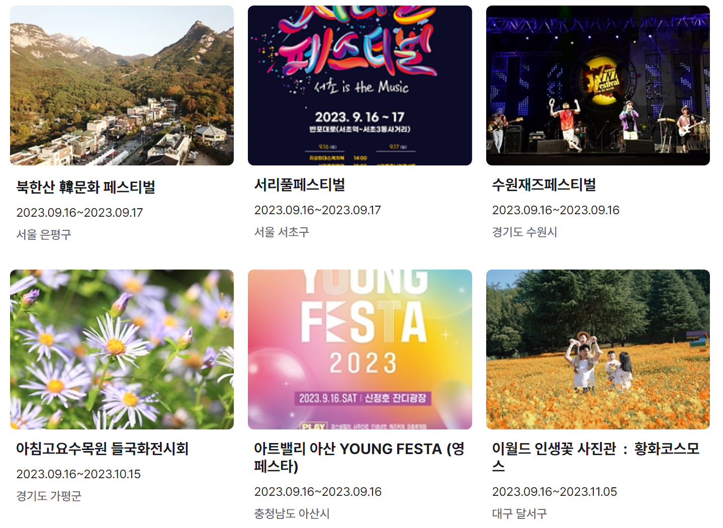 지금까지 9월 축제 가볼만한 곳 전국 일정표 (2023년)와 9월 축제 추천 행사를 정리했습니다. 요즘 계속해서 내리는 비로 인해 어느덧 더위는 물러나고 선선한 바람이 기분 좋은 날씨가 된 것 같습니다.