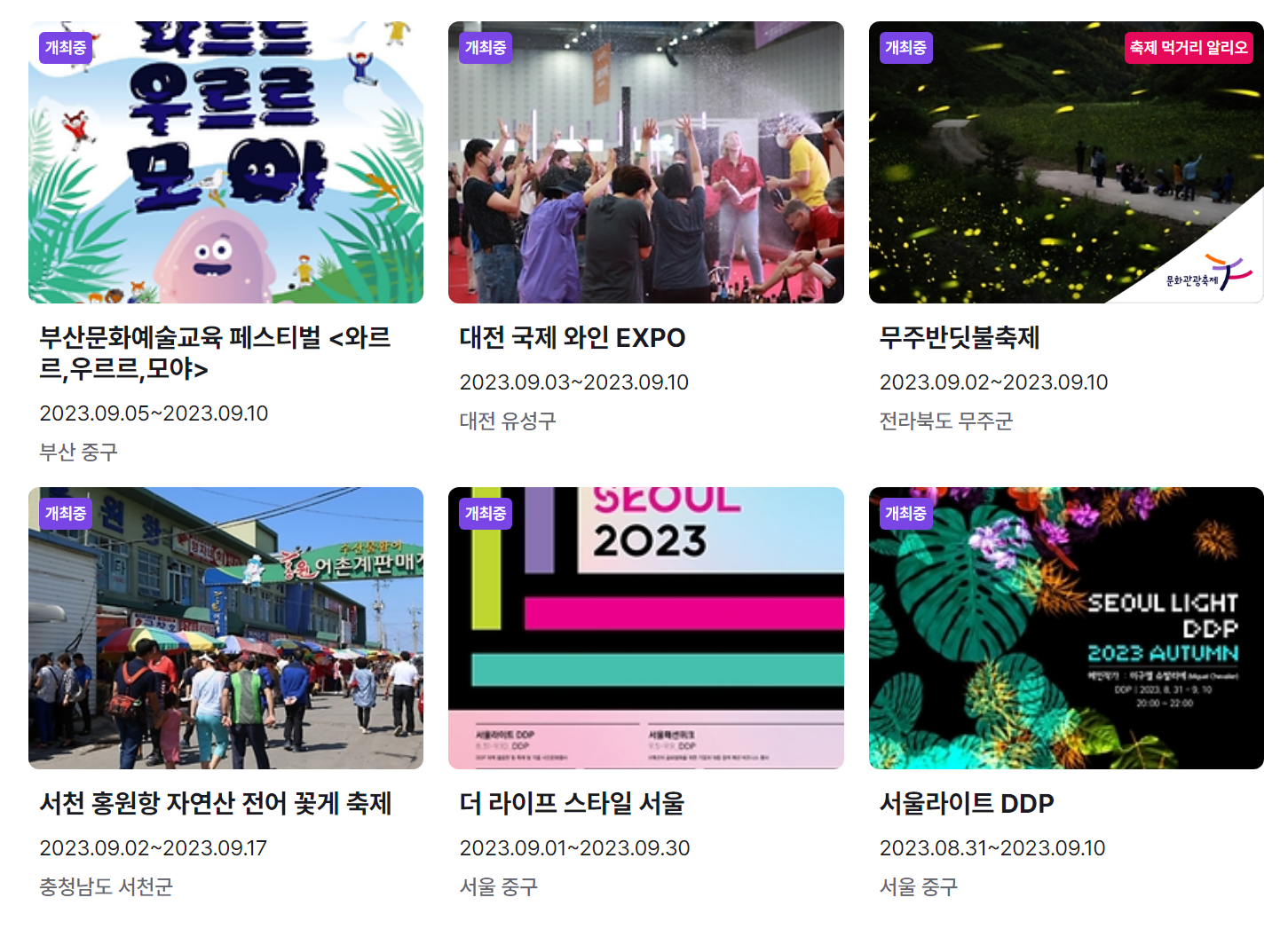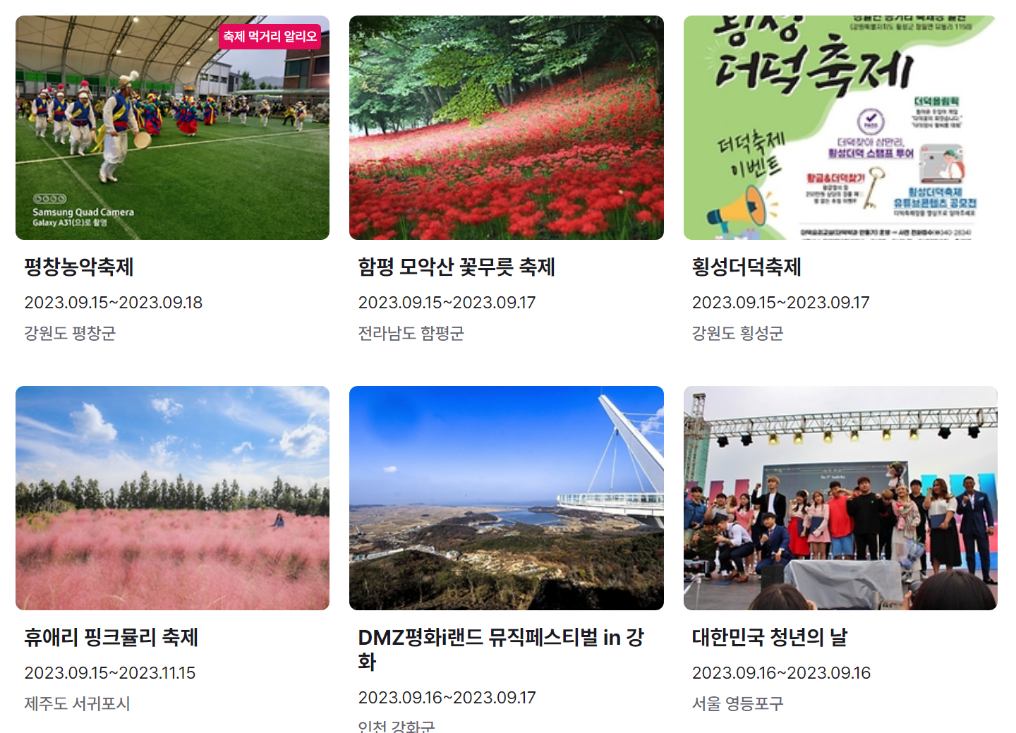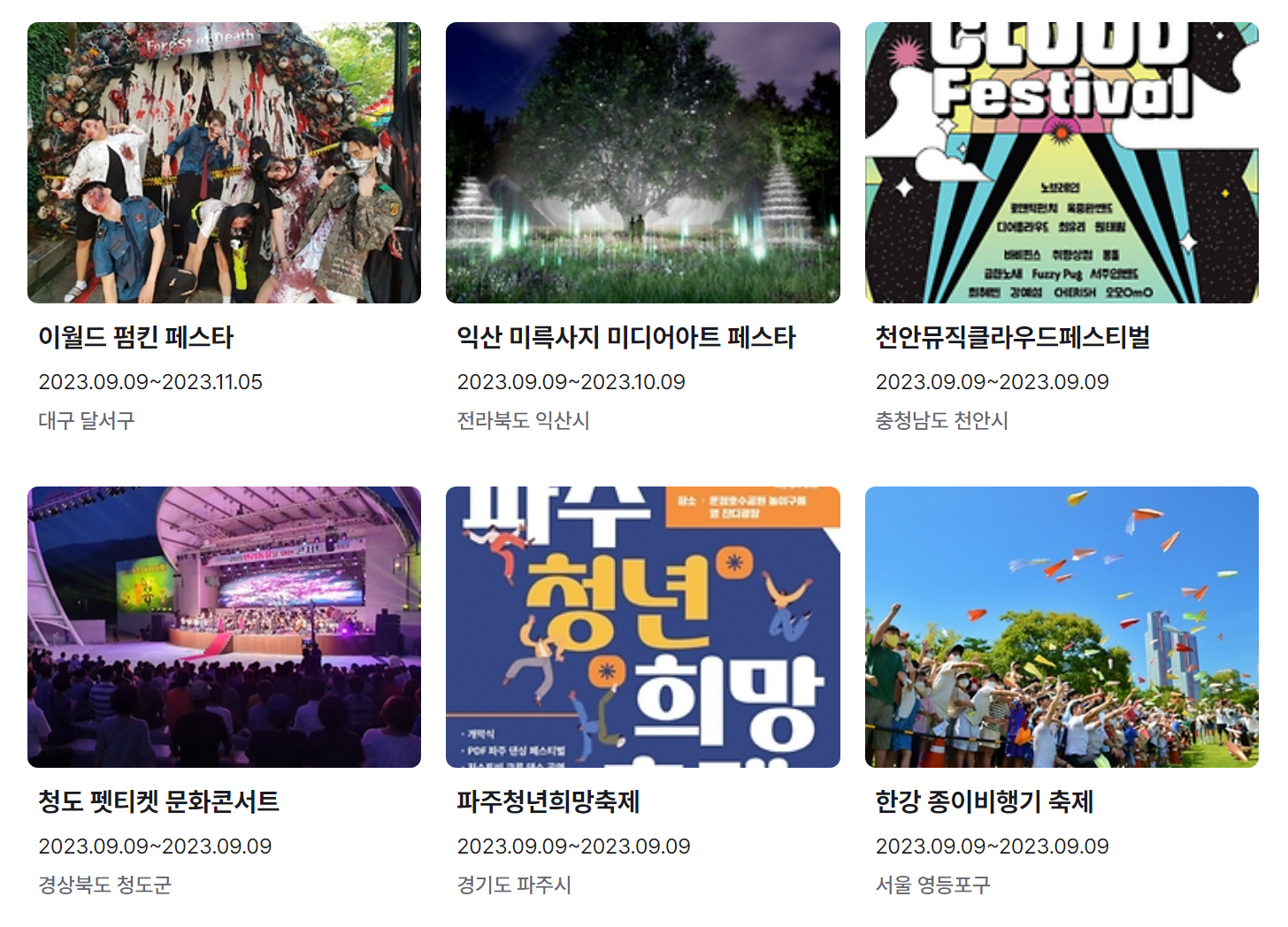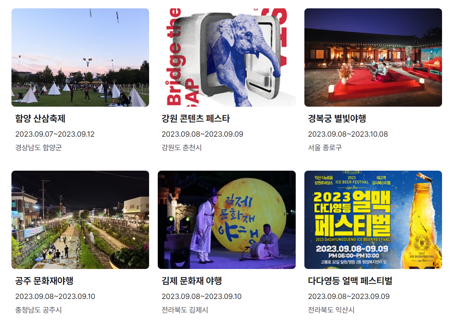 지금까지 9월 축제 가볼만한 곳 전국 일정표 (2023년)와 9월 축제 추천 행사를 정리했습니다. 요즘 계속해서 내리는 비로 인해 어느덧 더위는 물러나고 선선한 바람이 기분 좋은 날씨가 된 것 같습니다.