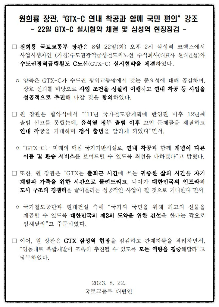 국토부와 현대건설이 지난 22일 GTX C노선 건설을 위한 실시협약을 체결했다는 소식입니다. 그동안 C노선은 사업 추진 과정에서 진통을 겪어왔다고 볼 수 있는데요, 현재 어떤 상황인지 GTX C노선 노선도 착공 개통시기를 자세히 정리해보도록 하겠습니다.