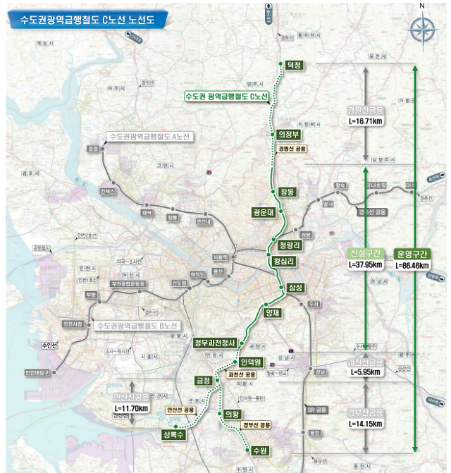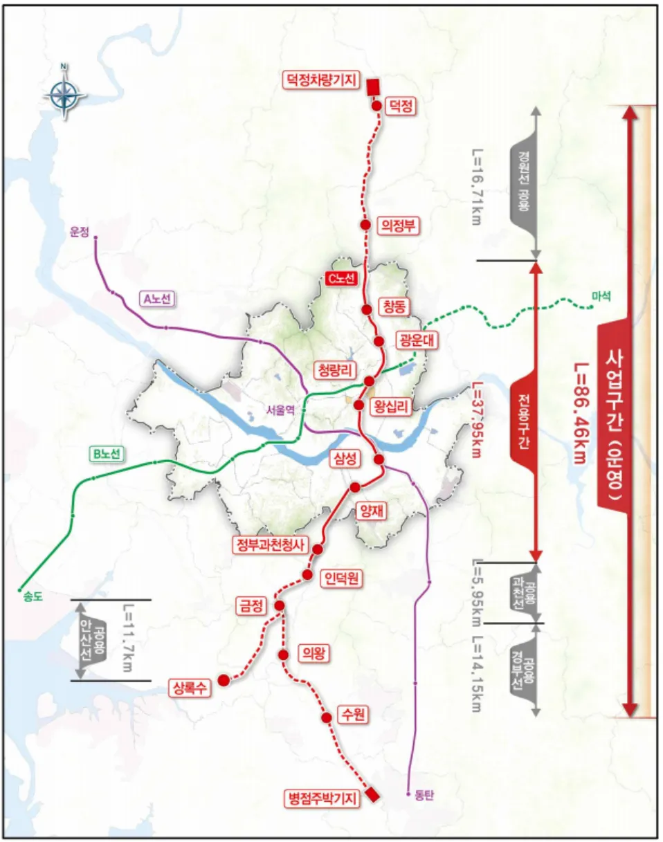 C노선은 양주 덕정역부터 수원역까지 총 86.46㎞로, 총 14개 정거장을 건설하게 되는데 민자사업자가 건설하고, 40년간 운영하는 수익형 민간투자사업으로 진행될 예정입니다.