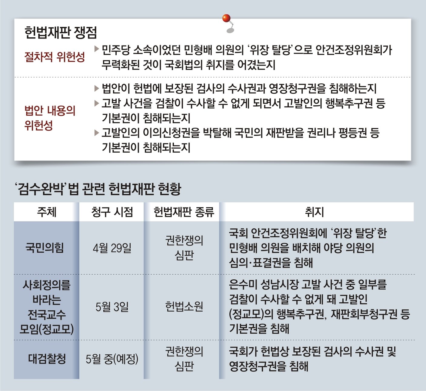 국민의힘과 별도로 6월 헌법소송을 낸 법무부와 검찰은 '검수완박법' 탓에 헌법에 보장된 검사의 수사권이 정상적으로 작동하지 못해 국민 보호에 공백이 생겼다는 주장을 펴고 있는 상황이고, 민주당의 경우 퇴임을 앞둔 문재인 전 대통령이 본회의 통과 직후 법률을 공포하는 등 검찰개혁이라는 목표 아래 두 법률을 속도감 있게 처리해 왔기 때문에 헌재 선고 결과에 따라 소송 상대방 중 한 곳은 치명상을 입을 가능성이 클 것이라는 전망이 우세한 상황입니다.