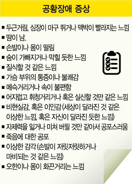 1. 가슴 두근거림, 식은땀, 몸의 떨림, 숨이 안 쉬어지거나 답답한 느낌, 질식할 것 같은 느낌