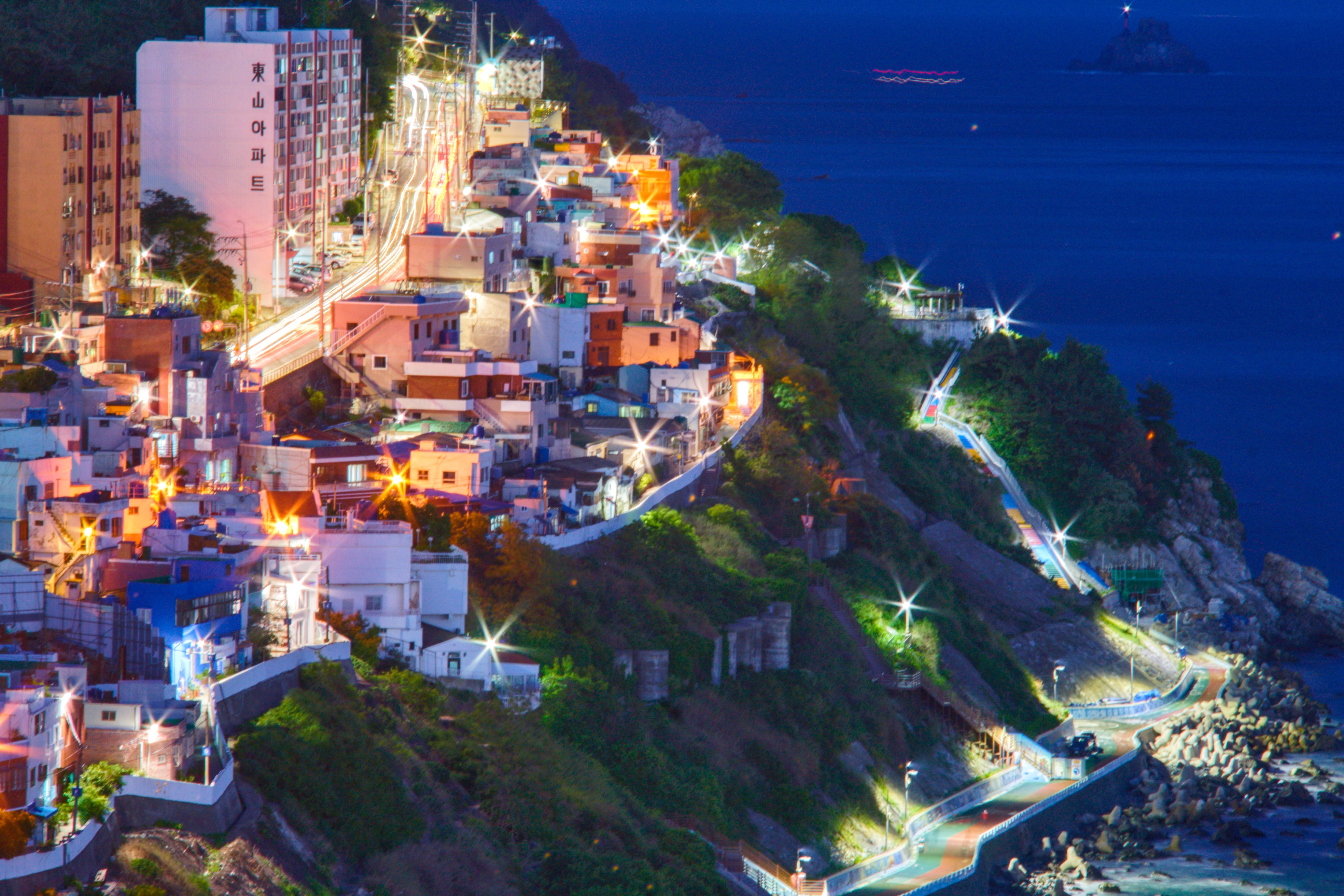 과거 노후화되고 주거 문제가 많았던 흰여울문화마을이 2010년대에 들어 골목길을 정비하고 마을 곳곳에 벽화를 그려 사진, 영상, 그림, 도자기 등 여러 방면의 예술가들을 입주시켜 탄생한 곳입니다. 특히 밤에 이곳을 찾으면 낮과는 또 다른 느낌의 예술 체험을 할 수 있는데요, 마을 곳곳에 숨어있는 벽화와 마을 앞바다에 별들이 떨어지는 황홀한 야경이 기억에 남는 경험을 제공해 줄 거예요. 부산항에 입항하기 위해 순서를 기다리는 상선들이 묘박지에 모여있는 모습은 마치 하나의 훌륭한 풍경화 같기도 합니다. 마을에는 절영해안산책로로 내려갈 수 있는 가파른 계단이 여러 개 있는데 그 중 절영해안산책로 끝자락에 있는 피아노 계단을 오르면 흰여울해안터널 앞으로 이어지는데요, 흰여울해안터널이 이곳의 대표적인 포토존이예요. 터널 안에서 보이는 남항대교와 수평선과 맞닿은 밤하늘이 인상적인 풍경을 자랑하며 해안터널을 지나서 바다 옆 산책로를 따라 약 2km 정도만 더가면 해녀들이 물질해온 해물을 즉석에서 파는 중리 해녀촌까지 이어지니 함께 들러 보시길 추천해요. 주로 멍게, 성게알, 해삼 등과 더불어 ‘성게알 김밥’이 유명하답니다.