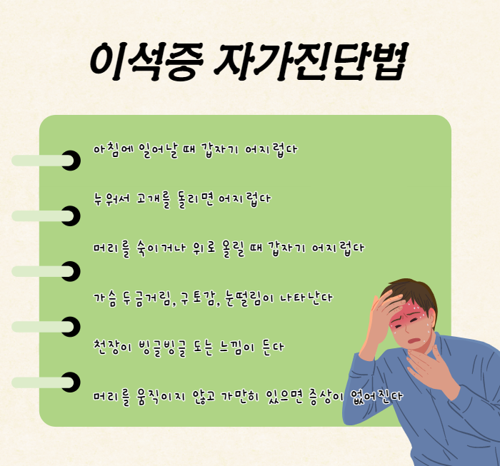 이석증 증상은 주로 아침에 잠자리에서 일어날 때 갑자기 회전감이 있는 현기증과 평형 장애를 발작적으로 경험하고, 머리를 움직일 때마다 1분 이내의 심한 어지럼이 반복되는 게 특징입니다.