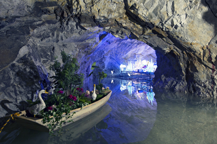 활옥동굴은 최근 방송과 SNS에 ‘핫 플레이스’로 떠오른 명소입니다. 1900년 발견되고 일제강점기(1922년)에 개발을 시작한 국내 유일의 백옥·활석·백운석 광산이라고 하는데요,한때 8000여 명이 일할 정도로 잘나가는 광산이었지만, 결국 폐광되어 오랫동안 방치되었다가 2019년 동굴 테마파크로 재탄생했습니다. 길이가 57km에 달하여 대한민국 최고의 동굴 테마파크로 불리는 이곳은 평균기온 11~15℃로, 여름에 시원하고 겨울에 따뜻하다고 합니다. 동굴 곳곳에 네온을 이용한 조형물이 있어 신비로움이 느껴지구요, 하이라이트는 암반수가 고여 생긴 호수로 2~3인용 투명 카약을 타고 여유롭게 동굴을 유람하는 체험도 가능합니다.