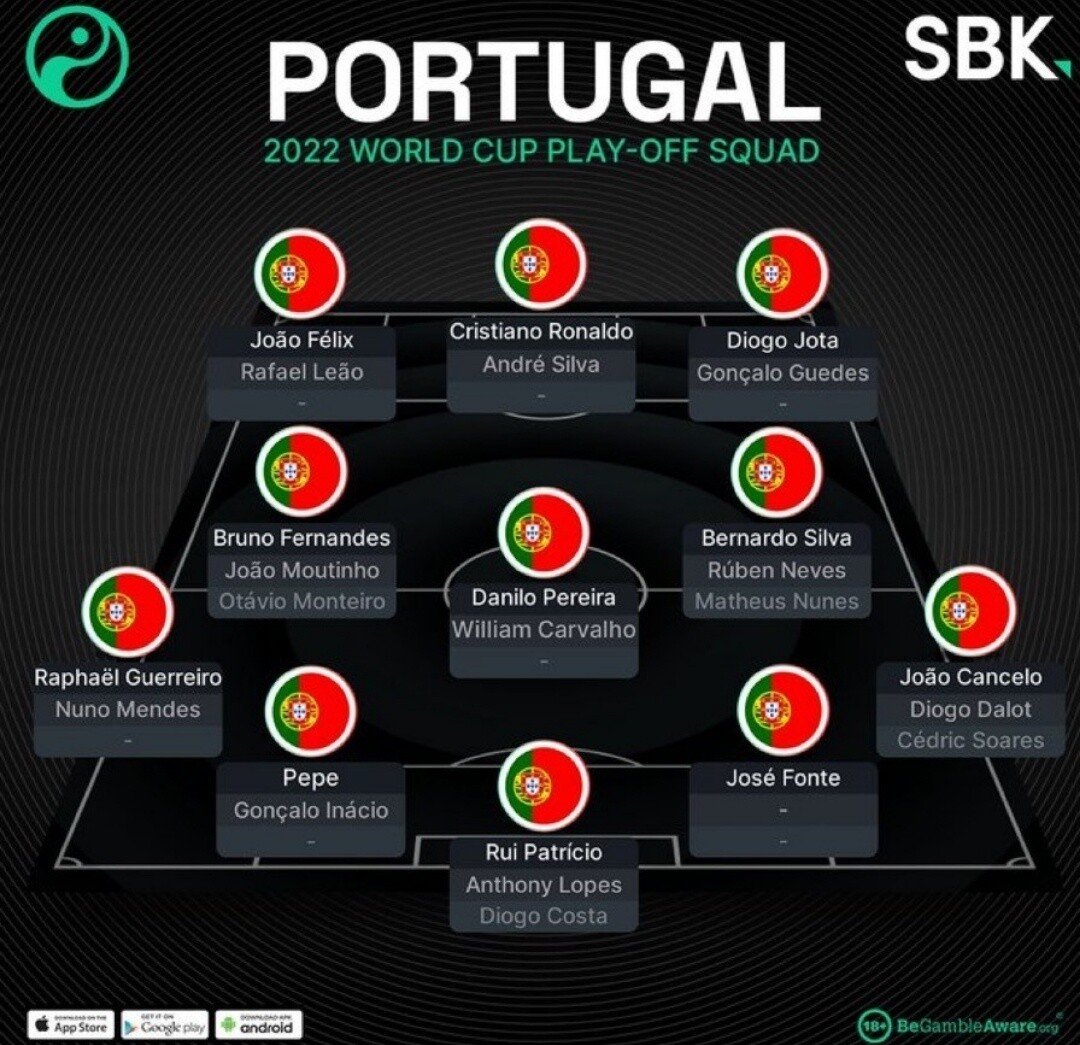 ▲ 미드필더(MF) = 주앙 팔리냐(풀럼), 후벵 네베스(울버햄프턴 원더러스), 베르나르두 실바(맨체스터 시티), 브루누 페르난데스(맨체스터 유나이티드), 주앙 마리우(벤피카), 마테우스 누네스(울버햄프턴 원더러스), 오타비우 몬테이루(포르투), 비티냐(파리 생제르맹), 윌리엄 카르발류(레알 베티스)