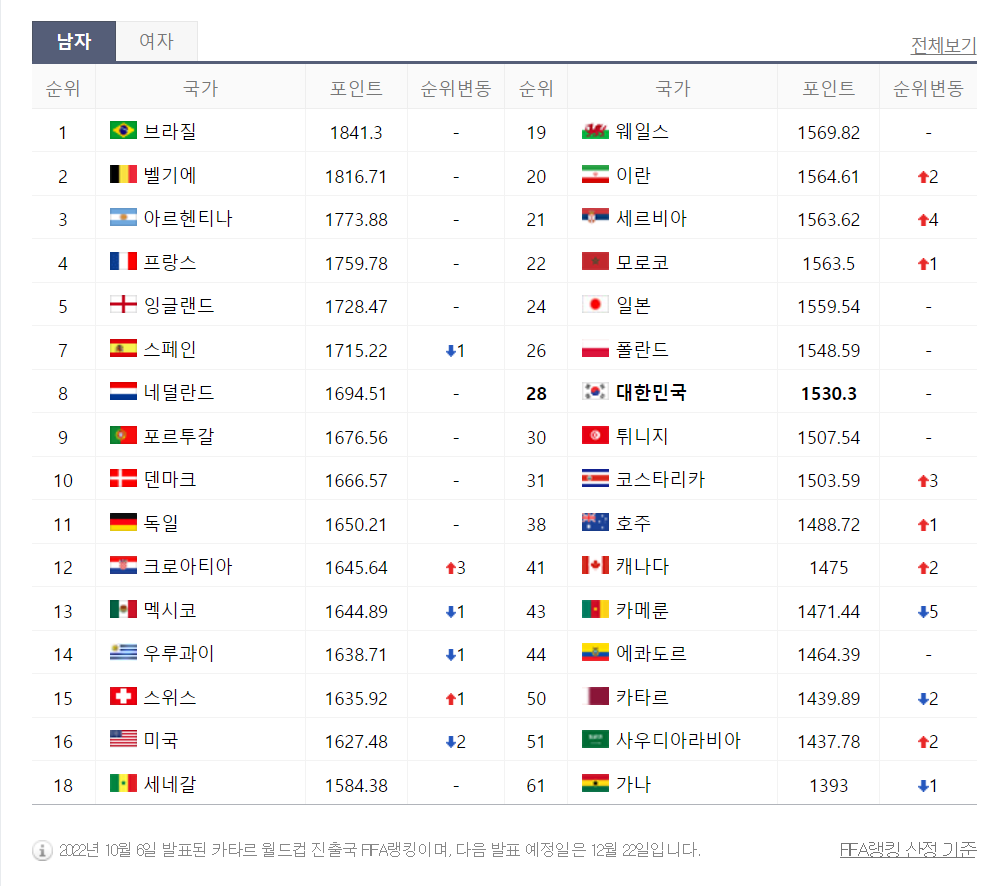 피파랭킹 '톱5'는 브라질, 벨기에, 아르헨티나, 프랑스, 잉글랜드 순이며 2022년 카타르월드컵에서 한국과 조별리그 H조에서 만날 포르투갈은 9위, 우루과이와 가나는 각각 14위와 61위입니다.